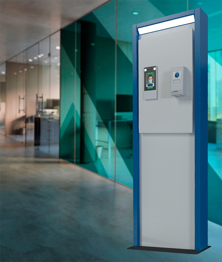 Permite una autocomprobación en la medición de temperatura, incorpora un dispensador de desinfectante sin contacto y adicionalmente un dispensador de mascarillas.